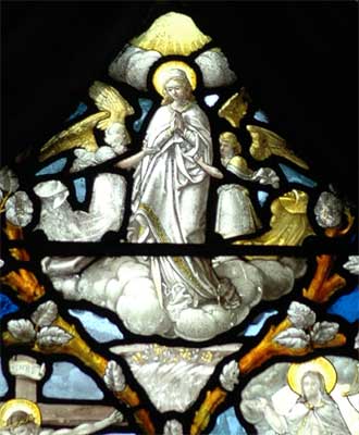 le Vierge monte au Ciel soutenue par deux anges. Cette assomption en âme et corps n'a été affirmée que par le pape Pie XII (encyclique Munificentissimus Deus)