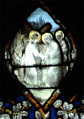 Jésus, portant sa croix, monte au mont du Crâne (Golgotha). Il rencontre Véronique qui lui essuie la face.